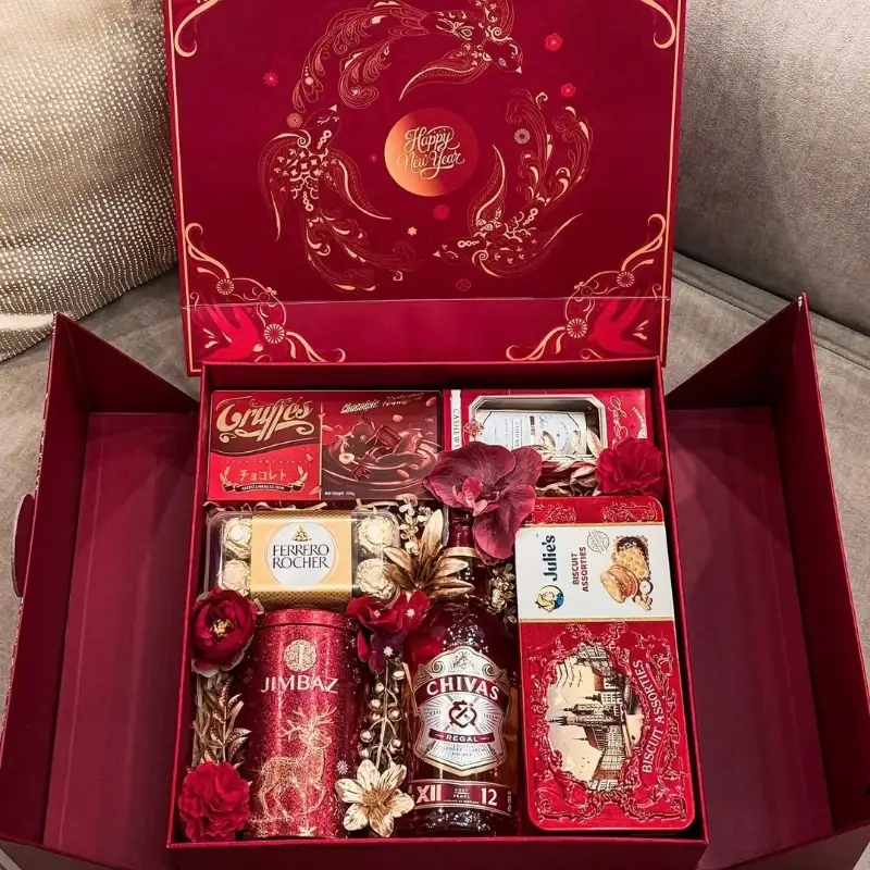 Những set quà Tết có rượu ngoại kết hợp cùng sắc đỏ luôn tạo ấn tượng mạnh về sự sang trọng và tinh tế. Sự xuất hiện của chai rượu như Chivas, XO, Hennessy, Macallan hoặc rượu vang nhập khẩu giúp tổng thể món quà trở nên đẳng cấp, phù hợp cho dịp biếu tặng trang trọng trong ngày đầu năm.