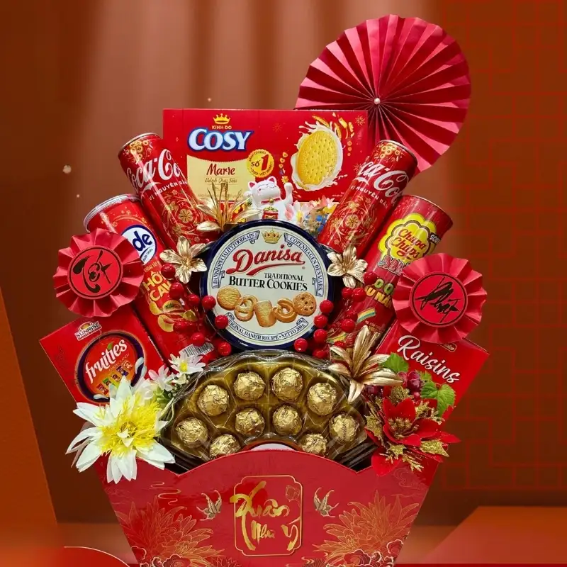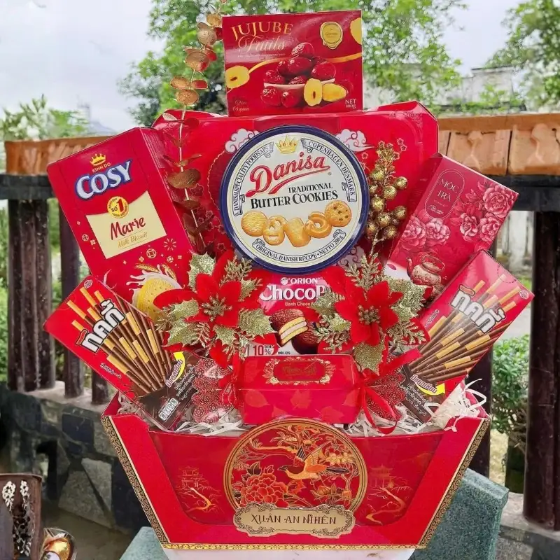 Thành phần phổ biến trong nhóm này thường là bánh kẹo trong nước có nguồn gốc rõ ràng, được chọn lọc kỹ lưỡng về chất lượng và hạn sử dụng. Việc đóng gói gọn gàng, phối màu hài hòa giúp set quà vẫn đảm bảo tính thẩm mỹ, đồng thời đáp ứng nhu cầu biếu tặng an tâm trong dịp đầu năm.