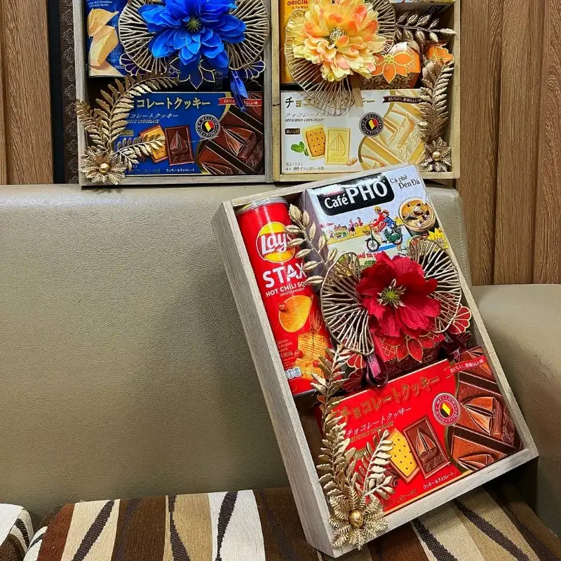 Mẫu phần quà thường có mức giá từ khoảng 500.000đ đến vài triệu đồng, linh hoạt theo thành phần bên trong từng set. Quý khách hàng có thể điều chỉnh rượu, bánh kẹo đi kèm và phong cách phối màu để phù hợp ngân sách cũng như đối tượng nhận quà.