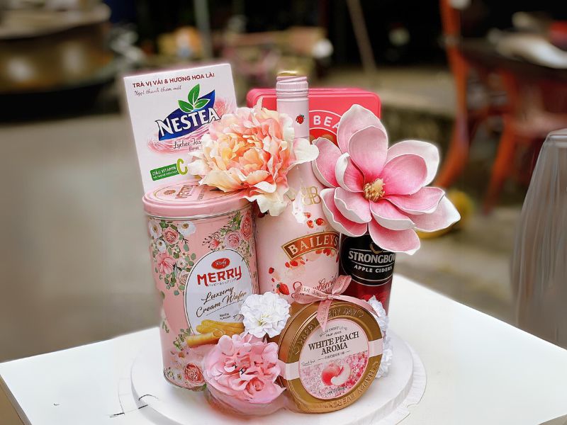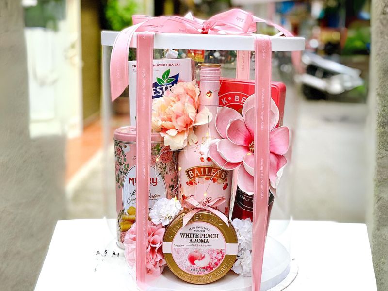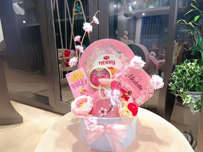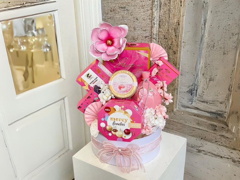 Các set quà màu hồng thường được trang trí đẹp mắt, với phụ kiện nhẹ nhàng, tạo nên những giỏ quà ấn tượng, truyền tải các thông điệp trong mỗi set quà tặng